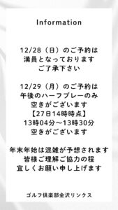 12/28(日)・29日(月)予約状況のご案内